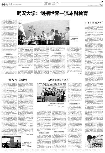 《武汉大学:剑指世界一流本科教育》《“教”与“学”双轮驱动》《为创新创业插上“双翼”》《百年常青“育人林”》,这些标题十分亮眼,生动地凸显出武大本科教育的亮点与特点。5月10日,《中国教育报》第12版用整版篇幅,图文并茂地报道了武汉大学开展本科教育改革、推进“三创”教育的做法和成效,四篇报道从不同侧面描绘出我校本科教育改革画卷。