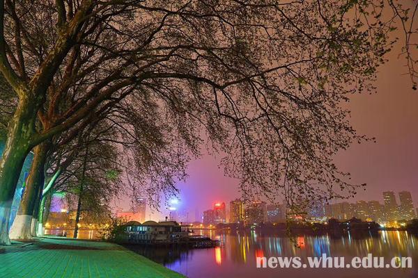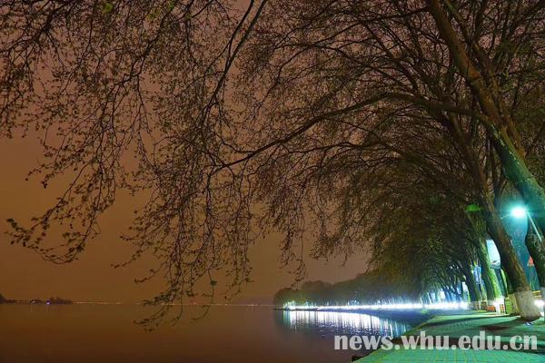 ▲梧桐树下是一湖春水,东湖水里是一城烟火。生命灿若星河,往昔不可再追。趁这夜晚,一弯好月,沿着绿堤,且行且沉醉。