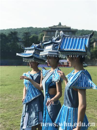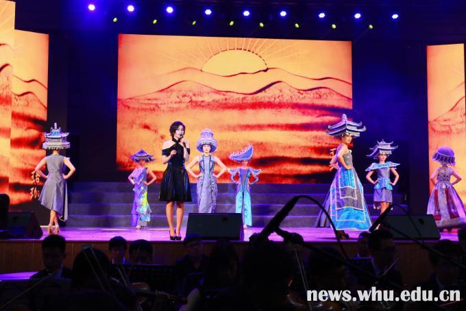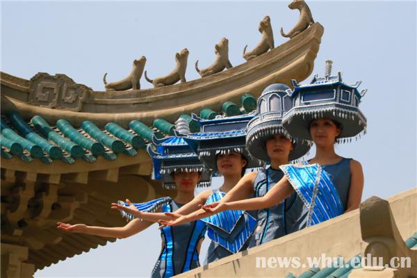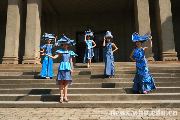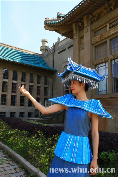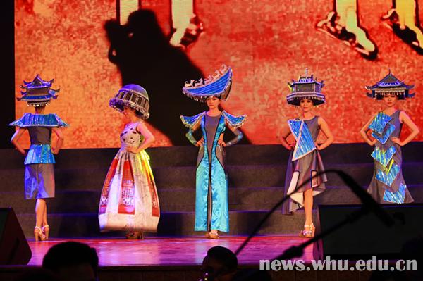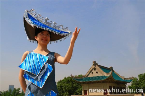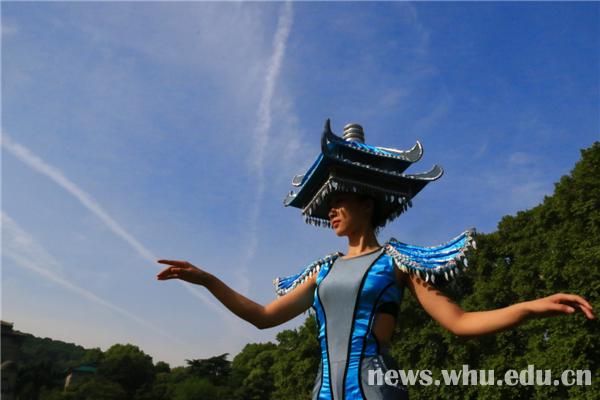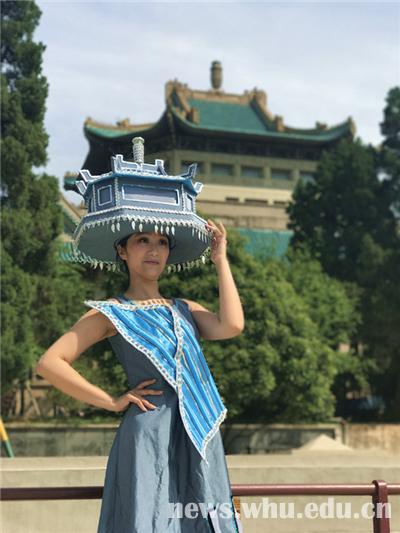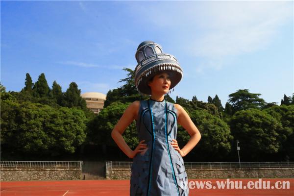一袭灰色衣裙点缀着琉璃瓦,头顶着武大建筑里的飞檐画角——这是武汉大学时装模特艺术协会带来的视觉享受。这套校园建筑文化系列服饰是我校原创作品,以老斋舍、老图、行政楼等建筑群为元素,将其装饰成礼冠,增添了一抹文化色彩,展示出珞珈知识女性的执着追求。