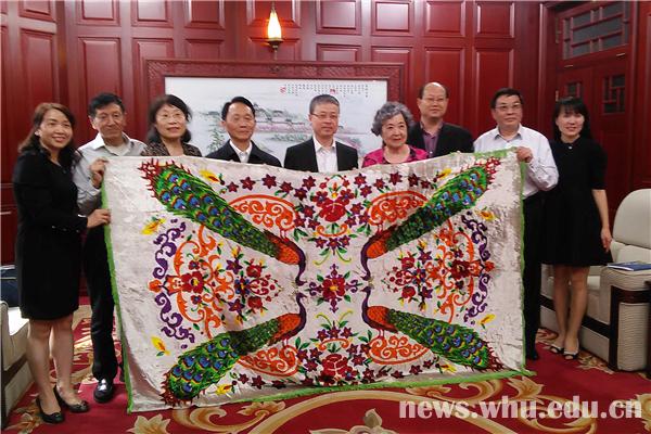 5月10日,萧毅肃的女儿萧良杰、汤商皓之子汤原华、武汉大学著名经济学家李崇淮之子李建岚和夫人王峻青一行来校,将这幅挂毯捐赠给武汉大学。校党委常务副书记、纪委书记黄泰岩出席捐赠仪式。
