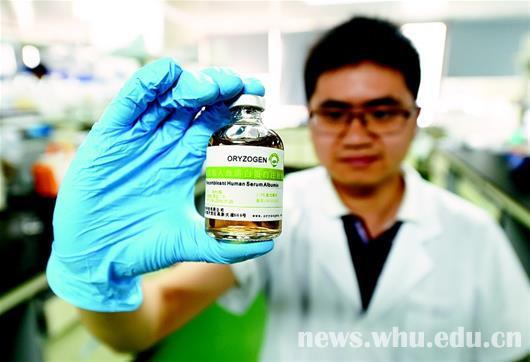 ▲研究人员展示从稻米中提取的人血清白蛋白注射液(张朋摄)