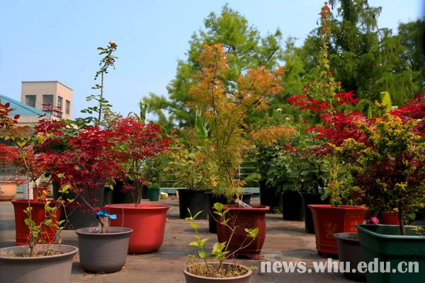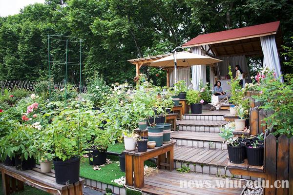 ▲爬上法学院的楼顶,是另一个小天地。登高以望远,养花以怡情。