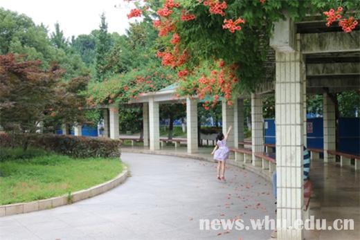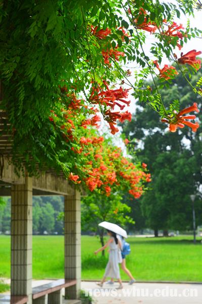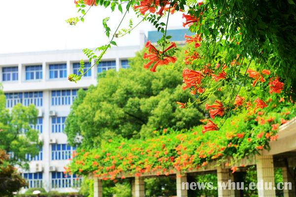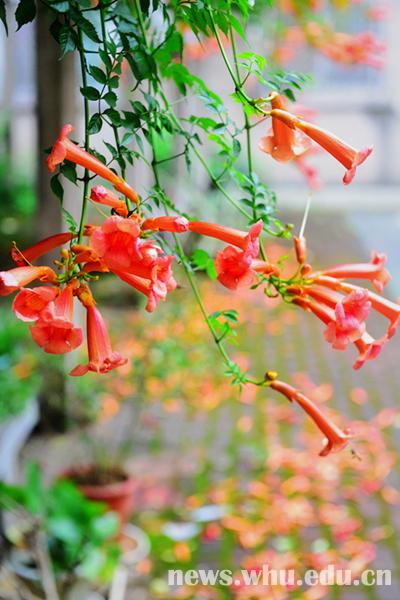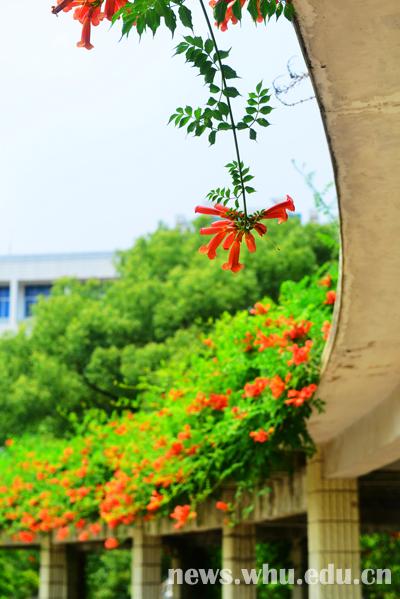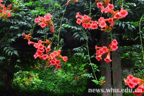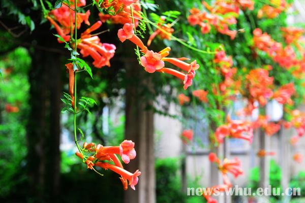 教五广场上那灿烂的凌霄花是否吸引了你的目光?毕业时节,绽放出一朵朵火红的“小喇叭”,为学子们吹奏一曲临别的歌。