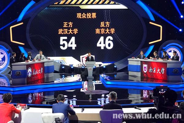 武汉大学和南京大学辩论队是本次比赛中最受关注的两支队伍,他们曾在初选赛、半决赛中对阵。当晚的冠亚军决赛是他们第三次过招,双方围绕“开除吸毒学生是利大于弊,还是弊大于利”的辩题,上演了一场精彩绝伦的巅峰对决,双方唇枪舌战、你来我往、妙语连珠,赢得现场观众的阵阵掌声。