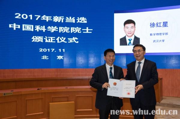 ▲中国科学院院长、党组书记白春礼为徐红星(左)颁发院士证书(中国科学院供图)