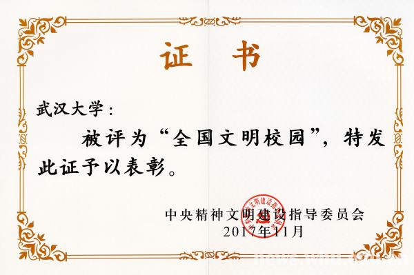 11月17日,全国精神文明建设表彰大会在京举行,武汉大学获第一届全国文明校园荣誉称号,中南医院获第五届“全国文明单位”荣誉称号。学校以2015年获评全国文明单位为重要契机,进一步加大精神文明创建工作力度,综合实力和核心竞争力显著增强,人才培养质量、社会声誉和国际影响力稳步提升,位列中国高校社会影响力2017年度排行榜第三。